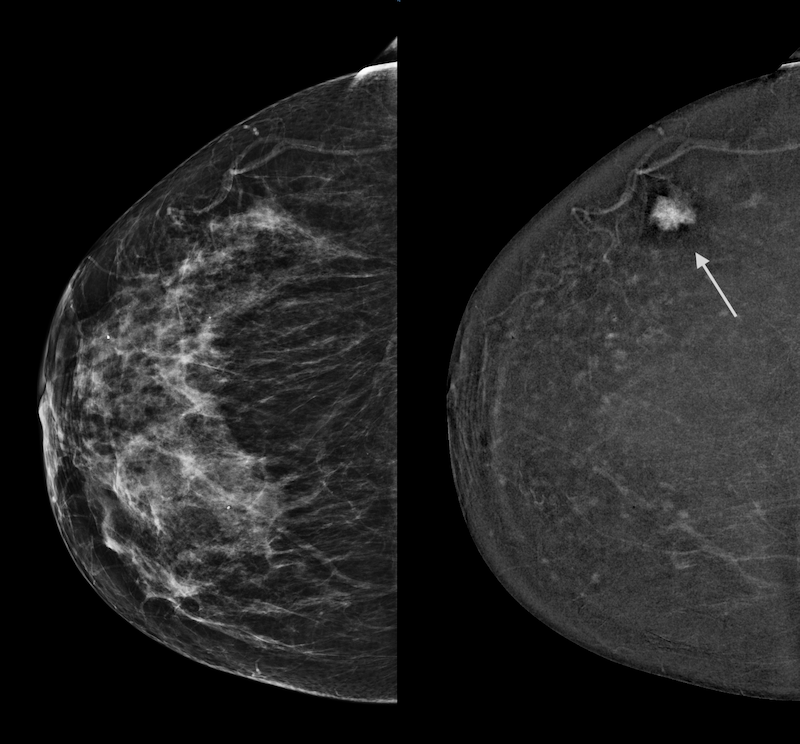 Here’s an example: 2 images of the same breast, on the same day. Traditional mammogram on left: the cancer is not visible. CEM image on the right is not limited by the dense tissue and highlights the cancer (arrow).